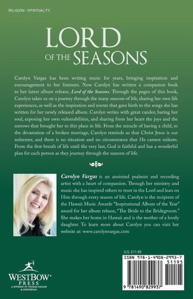 Carolyn Vargas has been writing music for years, bringing inspiration and encouragement to her listeners. Now Carolyn has written a companion book to her latest album release, Lord of the Seasons. Through the pages of this book, Carolyn takes us on a journey through the many seasons of life, sharing her own life experiences, as well as the inspiration and events that gave birth to the songs she has written for her newly released album. Carolyn writes with great candor, baring her soul, exposing her own vulnerabilities, and sharing from her heart the joys and the sorrows that brought her to this place in life. From the miracle of having a child, to the devastation of a broken marriage, Carolyn reminds us that Christ Jesus is our redeemer, and there is no situation and no circumstance that He cannot redeem. From the first breath of life until the very last, God is faithful and has a wonderful plan for each person as they journey through the seasons of life.