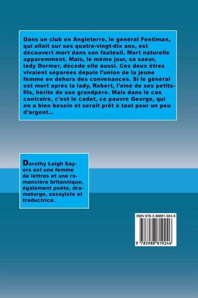 Dans un club en Angleterre, le général Fentiman, qui allait sur ses quatre-vingt-dix ans, est découvert mort dans son fauteuil. Mort naturelle apparemment. Mais, le même jour, sa soeur, lady Dormer, décède elle aussi. Ces deux êtres vivaient séparées depuis l'union de la jeune femme en dehors des convenances. Si le général est mort après la lady, Robert, l'aîné de ses petits-fils, hérite de son grandpère. Mais dans le cas contraire, c'est le cadet, ce pauvre George, qui en a bien besoin et serait prêt à tout pour un peu d'argent...