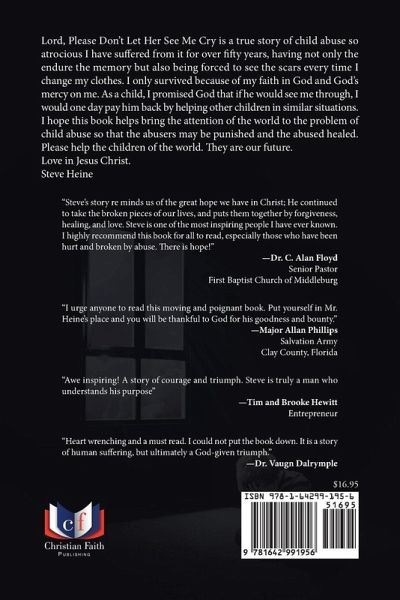 Lord, Please Don't Let Her See Me Cry is a true story of child abuse so atrocious I have suffered from it for over fifty years, having not only the endure the memory but also being forced to see the scars every time I change my clothes. I only survived because of my faith in God and God's mercy on me. As a child, I promised God that if he would see me through, I would one day pay him back by helping other children in similar situations. I hope this book helps bring the attention of the world to the problem of child abuse so that the abusers may be punished and the abused healed. Please help the children of the world. They are our future. Love in Jesus Christ. Steve Heine
