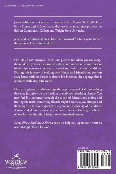 Life is filled with changes—there is no place to run where you can escape them. When you are emotionally alone and uncertain about present friendships, you may experience the need and desire for new friendships. During this journey of seeking new friends and friendships, you can clasp hands with the Savior to absorb His blessings like a sponge that is saturated with only pure water. Discovering friends and friendships through the eyes of God is something that may just give you the freedom to embrace refreshing change. You may feel His presence through the touch of friends, and seeing and hearing the truth concerning friends might become a joy. Hunger and thirst for friends may be quenched as you taste the beauty of friendship. A sweet and glorious aroma may permeate the air as God's gentle breeze of love lavishes the gift of friends to be cherished forever. Lord, Please Send Me a Friend seeks to help you open your heart to relationships blessed by God.