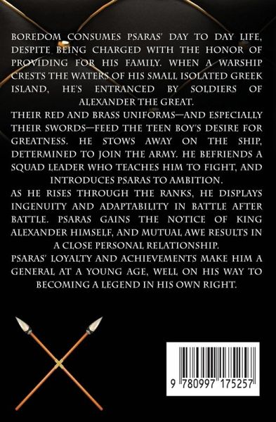 Boredom consumes Psaras’ day to day life, despite being charged with the honor of providing for his family. When a warship crests the waters of his small isolated Greek island, he’s entranced by soldiers of Alexander the Great. Their red and brass uniforms—and especially their swords—feed the teen boy’s desire for greatness. He stows away on the ship, determined to join the army. He befriends a squad leader who teaches him to fight, and introduces Psaras to ambition. As he rises through the ranks, he displays ingenuity and adaptability in battle after battle. Psaras gains the notice of King Alexander himself, and mutual awe results in a close personal relationship. Psaras’ loyalty and achievements make him a general at a young age, well on his way to becoming a legend in his own right.