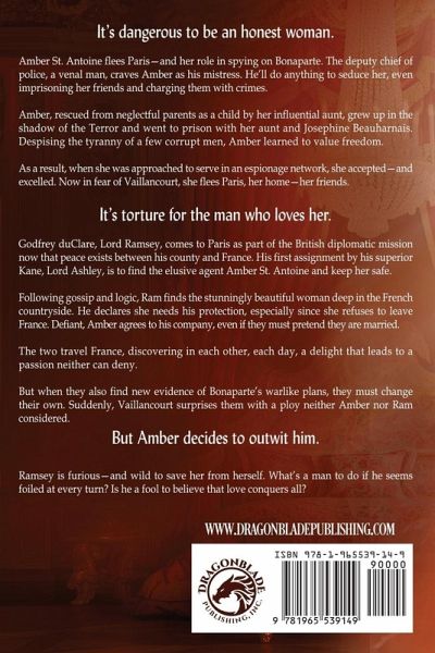 It's dangerous to be an honest woman. Amber St. Antoine flees Paris-and her role in spying on Bonaparte. The deputy chief of police, a venal man, craves Amber as his mistress. He'll do anything to seduce her, even imprisoning her friends and charging them with crimes. Amber, rescued from neglectful parents as a child by her influential aunt, grew up in the shadow of the Terror and went to prison with her aunt and Josephine Beauharnais. Despising the tyranny of a few corrupt men, Amber learned to value freedom. As a result, when she was approached to serve in an espionage network, she accepted-and excelled. Now in fear of Vaillancourt, she flees Paris, her home-her friends. It's torture for the man who loves her. Godfrey duClare, Lord Ramsey, comes to Paris as part of the British diplomatic mission now that peace exists between his county and France. His first assignment by his superior Kane, Lord Ashley, is to find the elusive agent Amber St. Antoine and keep her safe. Following gossip and logic, Ram finds the stunningly beautiful woman deep in the French countryside. He declares she needs his protection, especially since she refuses to leave France. Defiant, Amber agrees to his company, even if they must pretend they are married. The two travel France, discovering in each other, each day, a delight that leads to a passion neither can deny. But when they also find new evidence of Bonaparte's warlike plans, they must change their own. Suddenly, Vaillancourt surprises them with a ploy neither Amber nor Ram considered. But Amber decides to outwit him. Ramsey is furious-and wild to save her from herself. What's a man to do if he seems foiled at every turn? Is he a fool to believe that love conquers all?