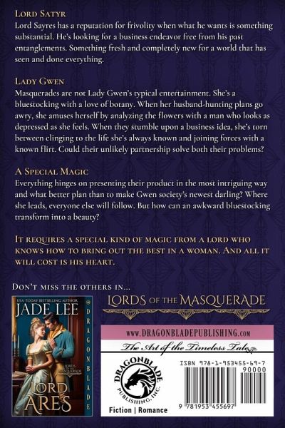 Welcome to book 2 in the fabulous new series Lords of the Masquerade by USA Today Bestselling Author Jade Lee. Lord Satyr Lord Sayres has a reputation for frivolity when what he wants is something substantial. He's looking for a business endeavor free from his past entanglements. Something fresh and completely new for a world that has seen and done everything. Lady Gwen Masquerades are not Lady Gwen's typical entertainment. She's a bluestocking with a love of botany. When her husband-hunting plans go awry, she amuses herself by analyzing the flowers with a man who looks as depressed as she feels. When they stumble upon a business idea, she's torn between clinging to the life she's always known and joining forces with a known flirt. Could their unlikely partnership solve both their problems? A Special Magic Everything hinges on presenting their product in the most intriguing way and what better plan than to make Gwen society's newest darling? Where she leads, everyone else will follow. But how can an awkward bluestocking transform into a beauty? It requires a special kind of magic from a lord who knows how to bring out the best in a woman. And all it will cost is his heart. Lords of the Masquerade Book 1 - Lord Lucifer Book 2 - Lord Satyr Book 3 - Lord Ares Book 4 - Lord Scot Book 5 - Lady Scot Book 6 - Almost a Scot