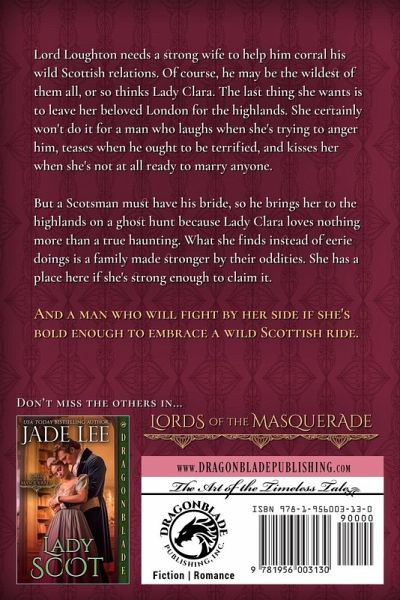 Lord Loughton needs a strong wife to help him corral his wild Scottish relations. Of course, he may be the wildest of them all, or so thinks Lady Clara. The last thing she wants is to leave her beloved London for the highlands. She certainly won't do it for a man who laughs when she's trying to anger him, teases when he ought to be terrified, and kisses her when she's not at all ready to marry anyone. But a Scotsman must have his bride, so he brings her to the highlands on a ghost hunt because Lady Clara loves nothing more than a true haunting. What she finds instead of eerie doings is a family made stronger by their oddities. She has a place here if she's strong enough to claim it. And a man who will fight by her side if she's bold enough to embrace a wild Scottish ride. Lords of the Masquerade Book 1 - Lord Lucifer Book 2 - Lord Satyr Book 3 - Lord Ares Book 4 - Lord Scot Book 5 - Lady Scot Book 6 - Almost a Scot