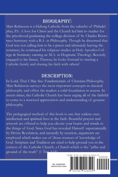 In Lord, That I May See: Fundamentals of Christian Philosophy, Robinson surveys the most important concepts in classical philosophy and offers the student a solid foundation in reason. In recent times, the Catholic Church has been urging all of the faithful to come to a renewed appreciation and understanding of genuine philosophy. The pedagogical method of this book is one that widens one's intellectual and spiritual lives in the faith. Beautiful prayers and artwork are offered to help you elevate your hearts and minds to the things of God. Since God has revealed Himself supernaturally by Divine Revelation, and naturally by creation, arguments are employed that make use of those avenues of knowledge of God. Scripture and Tradition are cited to help ground you in the context of the Catholic Church, a Church which is the "pillar and ground of the truth" (1 Tim 3:15).