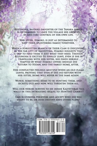 Kuzunoha, bastard daughter of the Tanaka family, is determined to leave the village she grew up in and take control of her own life. Her sister, Himiko, is just as determined to keep their splintering family together. When a forgotten branch of their clan is discovered in the far city of Kalvettika, Himiko suggests that a trip to find them is just what they need. Though Kuzunoha is excited to finally leave, even if she is travelling with her sister, she finds herself tempted by what Himiko offers should she return to Hidan, and the family home, after. Her conflicted feelings multiply when an old flame leaves, proving that even if she did return with her sister, home will never be the same again. Worse, something seems to be hunting them, and secrets, old and new, will threaten them all. Will our heroes survive to see inside Kalvettika's tall walls in this intriguing sequel to Hunter's Gambit? Can Kuzunoha persevere and accept who she was meant to be, or does destiny have other plans?