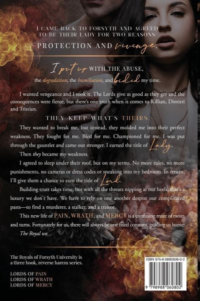 I came back to Forsyth and agreed to be their Lady for two reasons: protection and revenge. I put up with the abuse, the degradation, the humiliation, and bided my time. I wanted vengeance and I took it. The Lords give as good as they get and the consequences were fierce, but there's one truth when it comes to Killian, Dimitri and Tristian. They keep what's theirs. They wanted to break me, but instead, they molded me into their perfect weakness. They fought for me. Bled for me. Championed for me. I was put through the gauntlet and came out stronger. I earned the title of Lady. Then they became my weakness. I agreed to sleep under their roof, but on my terms. No more rules, no more punishments, no cameras or dress codes or sneaking into my bedroom. In return, I'll give them a chance to earn the title of Lord. Building trust takes time, but with all the threats nipping at our heels, that's a luxury we don't have. We have to rely on one another despite our complicated pasts-to find a murderer, a stalker, and a traitor. This new life of pain, wrath, and mercy is a confusing maze of twists and turns. Fortunately for us, there will always be one fixed constant, guiding us home: The Royal we. WARNING: This book is a DARK/BULLY romance. It contains graphic content that some readers may be particularly sensitive to. If you have triggers or are even remotely unsure, please heed the note at the beginning of this book. The Royals of Forsyth University is a reverse harem series by Best Selling Authors, Angel Lawson & Samantha Rue.