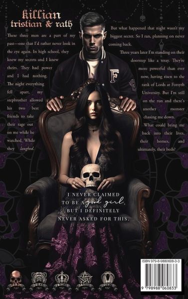 I never claimed to be a good girl, but I definitely never asked for this. Killian, Tristian, and Rath. These three men are a part of my past--one that I'd rather never look in the eye again. In high school, they knew my secrets and I knew theirs. They had power and I had nothing. The night everything fell apart, my stepbrother allowed his two best friends to take their rage out on me while he watched. While they laughed. But what happened that night wasn't my biggest secret. So I ran, planning on never coming back. Three years later I'm standing on their doorstep like a stray. They're more powerful than ever now, having risen to the rank of Lords at Forsyth University. But I'm still on the run and there's another monster chasing me down. What could bring me back into their lives, their homes, and ultimately, their beds? Fear. Shame. Desperation. Killian, Rath, and Tristian aren't the only ones who want me. There's someone far more dangerous out there who's been stalking me since I left town the first time. Someone who makes the evil I know feel less dangerous than the evil I don't. But being their Lady is more than just fancy clothes and reputation. I might be under their protection, but I'm also at their mercy.