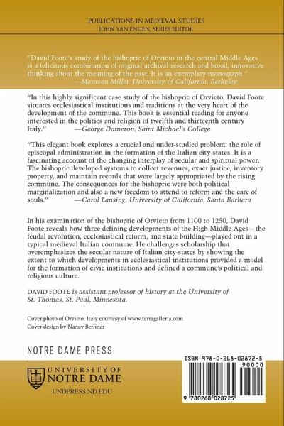 In his examination of the bishopric of Orvieto from 1100 to 1250, David Foote reveals how three defining developments of the High Middle Ages-the feudal revolution, ecclesiastical reform, and state building-played out in a typical medieval Italian commune. He challenges scholarship that overemphasizes the secular nature of Italian city-states by showing the extent to which developments in ecclesiastical institutions provided a model for the formation of civic institutions and defined a commune's political and religious culture. Following the collapse of Carolingian authority in the tenth century, Italy experienced a period of political chaos. Rural lords, unrestrained by central authority, fought to dominate the countryside. Bishoprics, by virtue of their temporal and spiritual authority over dioceses, emerged in the midst of this disorder as the most effective institutions for rebuilding political authority at the local level. The Orvietan bishopric formed the center of an urban coalition attempting to conquer and pacify their contado, or surrounding countryside. Orvieto's bishopric assisted the early city-state in administering its territory by developing innovative methods of written administration and record keeping. As the center of a wide range of religious interests, the bishopric was often caught between competing political and religious actors who leveraged their interests through ecclesiastical institutions and resources. This interaction had a profound effect on the city's political and religious culture. As Orvietans struggled to define the norms that would govern their society, they had to adapt their quest for political power and autonomy to their religious values. David Foote's deeply researched new book illuminates the process of state building in its early stages and the formation of political and religious culture in Europe during the High Middle Ages.