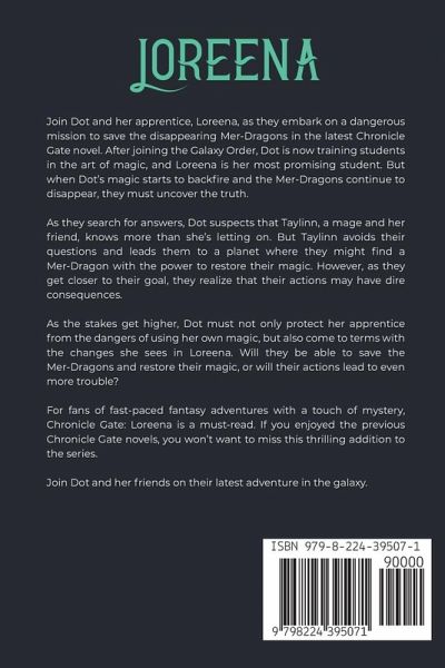 Join Dot and her apprentice, Loreena, as they embark on a dangerous mission to save the disappearing Mer-Dragons in the latest Chronicle Gate novel. After joining the Galaxy Order, Dot is now training students in the art of magic, and Loreena is her most promising student. But when Dot's magic starts to backfire and the Mer-Dragons continue to disappear, they must uncover the truth. As they search for answers, Dot suspects that Taylinn, a mage and her friend, knows more than she's letting on. But Taylinn avoids their questions and leads them to a planet where they might find a Mer-Dragon with the power to restore their magic. However, as they get closer to their goal, they realize that their actions may have dire consequences. As the stakes get higher, Dot must not only protect her apprentice from the dangers of using her own magic, but also come to terms with the changes she sees in Loreena. Will they be able to save the Mer-Dragons and restore their magic, or will their actions lead to even more trouble? For fans of fast-paced fantasy adventures with a touch of mystery, Chronicle Gate: Loreena is a must-read. If you enjoyed the previous Chronicle Gate novels, you won't want to miss this thrilling addition to the series. Join Dot and her friends on their latest adventure in the galaxy. This can also be enjoyed as a stand alone as well.
