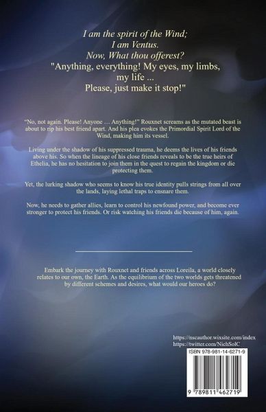 I am the spirit of the Wind;I am Ventus.Now, What thou offerest?"Anything, everything! My eyes, my limbs,my life ...Please, just make it stop!" "No, not again. Please! Anyone ... Anything!" Rouxnet screams as the mutated beast is about to rip his best friend apart. And his plea evokes the Primordial Spirit Lord of the Wind, making him its vessel. Living under the shadow of his suppressed trauma, he deems the lives of his friends above his. So when the lineage of his close friends reveals to be the true heirs of Ethelia, he has no hesitation to join them in the quest to regain the kingdom or die protecting them. Yet, the lurking shadow who seems to know his true identity pulls strings from all over the lands, laying lethal traps to ensnare them. Now, he needs to gather allies, learn to control his newfound power, and become ever stronger to protect his friends. Or risk watching his friends die because of him, again. Embark the journey with Rouxnet and friends across Loreila, a world closely relates to our own, the Earth. As the equilibrium of the two worlds gets threatened by different schemes and desires, what would our heroes do?