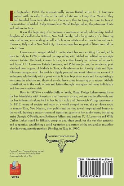 In September, 1922, the internationally known British writer D. H. Lawrence arrived with his wife, Frieda, at the railroad station in Lamy, New Mexico. They had traveled from Australia to San Francisco, then to Lamy, to come to Taos at the invitation of Mabel Dodge Sterne, later Mabel Dodge Luhan, the patroness of arts and culture in Taos. It was the beginning of an intense, sometimes strained, relationship. Mabel, daughter of a well-to-do Buffalo, New York family, had a long history of cultivating arts and letters, surrounding herself with famous artists and writers in her salons in Florence, Italy and in New York City. She continued her support of literature and the arts in Taos. Lawrence encouraged Mabel to write about her own exciting life and, while back in Italy in 1925, continued corresponding with Mabel and edited manuscripts she sent to him. Her book, "Lorenzo in Taos," is written loosely in the form of letters to and from D. H. Lawrence, Frieda Lawrence, and Robinson Jeffers, the celebrated poet who had been a guest of Mabel's in Taos, with references to Dorothy Brett and Spud Johnson among others. The book is a highly personal and most informative account of an intense relationship with a great writer. It is an important work and its reprinting is welcomed by scholars and those of us who have come increasingly to respect Mabel's contributions in the world of arts and letters through her support of many individuals and her own creative spirit. Born in 1879 to a wealthy Buffalo family, Mabel Dodge Luhan earned fame for her friendships with American and European artists, writers and intellectuals and for her influential salons held in her Italian villa and Greenwich Village apartments. In 1917, weary of society and wary of a world steeped in war, she set down roots in remote Taos, New Mexico, then publicized the tiny town's inspirational beauty to the world, drawing a steady stream of significant guests to her adobe estate, including artist Georgia O'Keeffe, poet Robinson Jeffers, and authors D. H. Lawrence and Willa Cather. Luhan could be difficult, complex and often cruel, yet she was also generous and supportive, establishing a solid reputation as a patron of the arts and as an author of widely read autobiographies. She died in Taos in 1962.