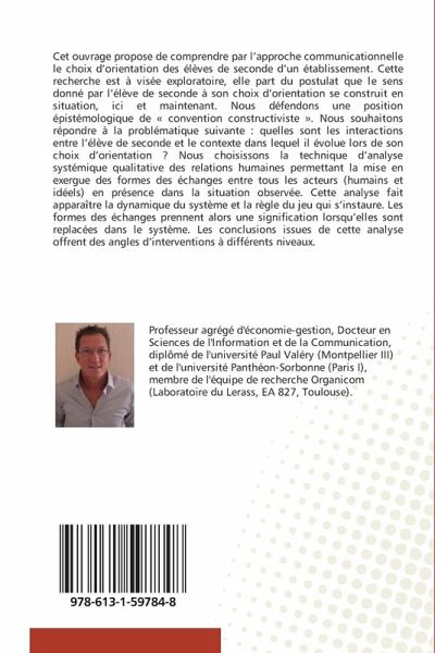 Cet ouvrage propose de comprendre par l'approche communicationnelle le choix d'orientation des élèves de seconde d'un établissement. Cette recherche est à visée exploratoire, elle part du postulat que le sens donné par l'élève de seconde à son choix d'orientation se construit en situation, ici et maintenant. Nous défendons une position épistémologique de " convention constructiviste ". Nous souhaitons répondre à la problématique suivante : quelles sont les interactions entre l'élève de seconde et le contexte dans lequel il évolue lors de son choix d'orientation ? Nous choisissons la technique d'analyse systémique qualitative des relations humaines permettant la mise en exergue des formes des échanges entre tous les acteurs (humains et idéels) en présence dans la situation observée. Cette analyse fait apparaître la dynamique du système et la règle du jeu qui s'instaure. Les formes des échanges prennent alors une signification lorsqu'elles sont replacées dans le système. Les conclusions issues de cette analyse offrent des angles d'interventions à différents niveaux.