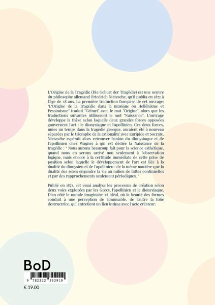 L'Origine de la Tragédie (Die Geburt der Tragödie) est une oeuvre du philosophe allemand Friedrich Nietzsche, qu'il publia en 1872 à l'âge de 28 ans. La première traduction française de cet ouvrage: "L'Origine de la Tragédie dans la musique ou Hellénisme et Pessimisme" traduit "Geburt" avec le mot "Origine", alors que les traductions suivantes utiliseront le mot "Naissance". L'ouvrage développe la thèse selon laquelle deux grandes forces opposées gouvernent l'art : le dionysiaque et l'apollinien. Ces deux forces, unies un temps dans la tragédie grecque, auraient été à nouveau séparées par le triomphe de la rationalité avec Euripide et Socrate. Nietzsche espérait alors retrouver l'union du dionysiaque et de l'apollinien chez Wagner à qui est dédiée la Naissance de la tragédie : " Nous aurons beaucoup fait pour la science esthétique, quand nous en serons arrivé non seulement à l'observation logique, mais encore à la certitude immédiate de cette prise de position selon laquelle le développement de l'art est liée à la dualité du dionysien et de l'apollinien : de la même manière que la dualité des sexes engendre la vie au milieu de luttes continuelles et par des rapprochements seulement périodiques. "Publié en 1872, cet essai analyse les processus de création selon deux voies explorées par les Grecs, l'apollinien et le dionysiaque. D'un côté le monde imaginaire et idéal, où la beauté des formes conduit à une perception de l'immuable, de l'autre la folie destructrice, qui entretient un lien intime avec l'acte créateur.