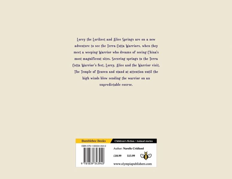 Lorry the Lorikeet and Alice Springs are on a new adventure to see the Terra Cotta Warriors, when they meet a weeping Warrior who dreams of seeing China's most magnificent sites. Securing springs to the Terra Cotta Warrior's feet, Lorry, Alice and the Warrior visit, The Temple of Heaven and stand at attention until the high winds blew sending the warrior on an unpredictable course.