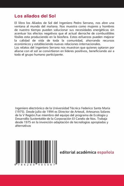 El libro los Aliados de Sol del Ingeniero Pedro Serrano, nos abre una ventana al mundo del mañana. Nos muestra como mujeres y hombres de nuestro tiempo pueden solucionar sus necesidades energéticas sin acentuar los efectos negativos que el actual derroche de combustibles fósiles esta produciendo en la biosfera. Estos esfuerzos pueden mejorar la calidad de vida de toda la comunidad, ahorrando recursos económicos y estableciendo nuevas relaciones internacionales.Los relatos del Ingeniero Serrano nos muestran que quienes optaron por aliarse con el sol se convirtieron en líderes positivos, beneficiando así a todo el grupo humano participante.