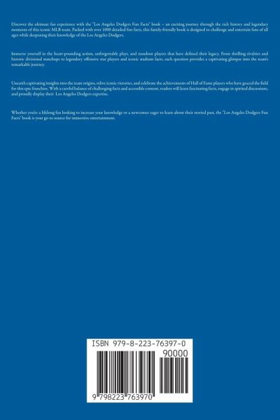 Discover the ultimate fan experience with the "Los Angeles Dodgers Fun Facts" book – an exciting journey through the rich history and legendary moments of this iconic MLB team. Packed with over 1000 detailed fun facts, this family-friendly book is designed to challenge and entertain fans of all ages while deepening their knowledge of the Los Angeles Dodgers. Immerse yourself in the heart-pounding action, unforgettable plays, and standout players that have defined their legacy. From thrilling rivalries and historic divisional matchups to legendary offensive star players and iconic stadium facts, each question provides a captivating glimpse into the team's remarkable journey. Unearth captivating insights into the team origins, relive iconic victories, and celebrate the achievements of Hall of Fame players who have graced the field for this epic franchise. With a careful balance of challenging facts and accessible content, readers will learn fascinating facts, engage in spirited discussions, and proudly display their Los Angeles Dodgers expertise. Whether you're a lifelong fan looking to increase your knowledge or a newcomer eager to learn about their storied past, the "Los Angeles Dodgers Fun Facts" book is your go-to source for immersive entertainment.
