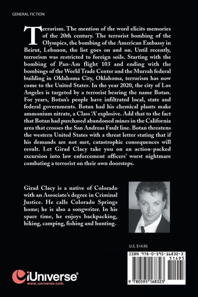 Terrorism. The mention of the word elicits memories of the 20th century. The terrorist bombing of the Olympics, the bombing of the American Embassy in Beirut, Lebanon, the list goes on and on. Until recently, terrorism was restricted to foreign soils. Starting with the bombing of Pan-Am flight 103 and ending with the bombings of the World Trade Center and the Murrah federal building in Oklahoma City, Oklahoma, terrorism has now come to the United States. In the year 2020, the city of Los Angeles is targeted by a terrorist bearing the name Botan. For years, Botan's people have infiltrated local, state and federal governments. Botan had his chemical plants make ammonium nitrate, a Class 'A' explosive. Add that to the fact that Botan had purchased abandoned mines in the California area that crosses the San Andreas Fault line. Botan threatens the western United States with a threat letter stating that if his demands are not met, catastrophic consequences will result. Let Girad Clacy take you on an action-packed excursion into law enforcement officers' worst nightmare combating a terrorist on their own doorsteps.