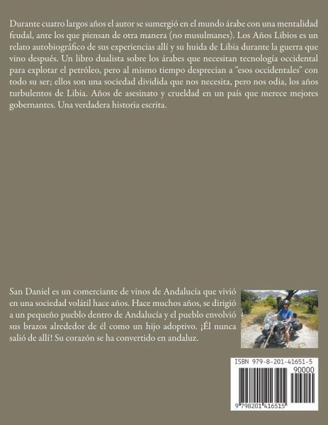 Durante cuatro largos años el autor se sumergió en el mundo árabe con una mentalidad feudal, ante los que piensan de otra manera (no musulmanes). Los Años Libios es un relato autobiográfico de sus experiencias allí y su huida de Libia durante la guerra que vino después. Un libro dualista sobre los árabes que necesitan tecnología occidental para explotar el petróleo, pero al mismo tiempo desprecian a "esos occidentales" con todo su ser; ellos son una sociedad dividida que nos necesita, pero nos odia, los años turbulentos de Libia. Años de asesinato y crueldad en un país que merece mejores gobernantes. Una verdadera historia escrita. San Daniel es un comerciante de vinos de Andalucía que vivió en una sociedad volátil hace años. Hace muchos años, se dirigió a un pequeño pueblo dentro de Andalucía y el pueblo envolvió sus brazos alrededor de él como un hijo adoptivo. ¡Él nunca salió de allí! Su corazón se ha convertido en andaluz.