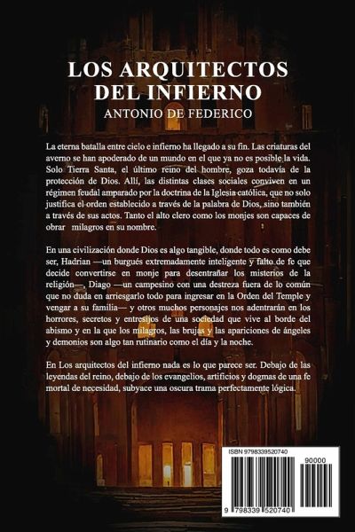 La eterna batalla entre cielo e infierno ha llegado a su fin. Las criaturas del averno se han apoderado de un mundo en el que ya no es posible la vida. Solo Tierra Santa, el último reino del hombre, goza todavía de la protección de Dios. Allí, las distintas clases sociales conviven en un régimen feudal amparado por la doctrina de la Iglesia católica, que no solo justifica el orden establecido a través de la palabra de Dios, sino también a través de sus actos. Tanto el alto clero como los monjes son capaces de obrar milagros en su nombre. En una civilización donde Dios es algo tangible, donde todo es como debe ser, Hadrian -un burgués extremadamente inteligente y falto de fe que decide convertirse en monje para desentrañar los misterios de la religión-, Diago -un campesino con una destreza fuera de lo común que no duda en arriesgarlo todo para ingresar en la Orden del Temple y vengar a su familia- y otros muchos personajes nos adentrarán en los horrores, secretos y entresijos de una sociedad que vive al borde del abismo y en la que los milagros, las brujas y las apariciones de ángeles y demonios son algo tan rutinario como el día y la noche. En Los arquitectos del infierno nada es lo que parece ser. Debajo de las leyendas del reino, debajo de los evangelios, artificios y dogmas de una fe mortal de necesidad, subyace una oscura trama perfectamente lógica.