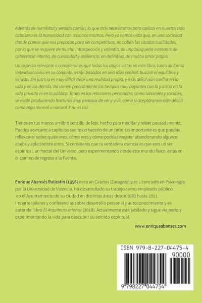 Además de humildad y sentido común, lo que más necesitamos para aplicar en nuestra vida cotidiana es la honestidad con nosotros mismos. Pero ya hemos visto que, en una sociedad donde parece que nos preparan para ser competitivos, no caben las citadas cualidades, por lo que se requiere de mucha introspección y valentía, de una búsqueda incesante de coherencia interna, de curiosidad y resiliencia, en definitiva, de mucho amor propio. Un aspecto relevante a considerar es que todos los atajos vistos en este libro, tanto de forma individual como en su conjunto, están basados en una idea central: buscan el equilibrio y lo justo. Sin justicia es muy difícil crear una realidad propia, y más difícil aún confiar en la vida y en los demás. No vienen precisamente los tiempos muy boyantes con la justicia en la vida privada ni en la pública. Tanto en las relaciones personales, como laborales y sociales, se están produciendo fracturas muy penosas de ver y vivir, como si aceptáramos este déficit como algo normal o natural. Y no es así. Tienes en tus manos un libro sencillo de leer, hecho para meditar y releer pausadamente. Puedes acercarte a capítulos sueltos o hacerlo de un tirón. Lo importante es que puedas reflexionar sobre quién eres, cómo eres y cómo podrías mejorar abandonando algunos atajos y aplicándote otros. Si consideras que tu verdadera esencia es que eres un ser espiritual, un fractal del Universo, pero experimentando desde este mundo físico, estás en el camino de regreso a la Fuente. Enrique Abansés Ballestín (1956) nace en Casetas (Zaragoza) y es Licenciado en Psicología por la Universidad de Valencia. Ha desarrollado su trabajo como empleado público en el Ayuntamiento de su ciudad en distintas áreas desde 1982 hasta 2021. Imparte talleres y conferencias sobre desarrollo personal y autoconocimiento y es autor del libro El Arquitecto Interior (2018). Actualmente está jubilado y sigue viajando y experimentando la vida para descubrir su sentido espiritual.