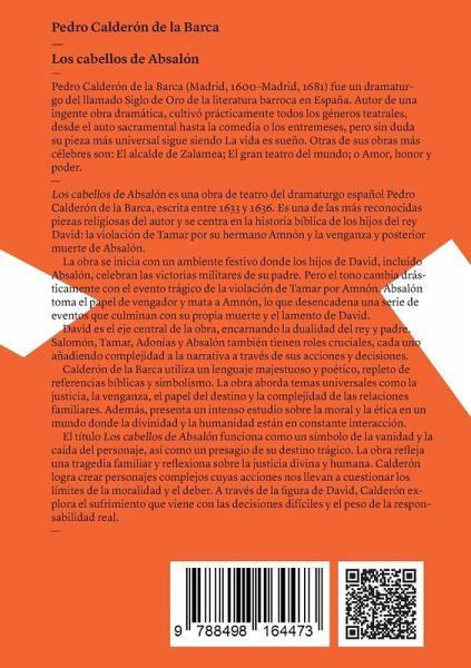 Los cabellos de Absalón es una obra de teatro del dramaturgo español Pedro Calderón de la Barca, escrita entre 1633 y 1636. Es una de las más reconocidas piezas religiosas del autor y se centra en la historia bíblica de los hijos del rey David: la violación de Tamar por su hermano Amnón y la venganza y posterior muerte de Absalón. La obra se inicia con un ambiente festivo donde los hijos de David, incluido Absalón, celebran las victorias militares de su padre. Pero el tono cambia drásticamente con el evento trágico de la violación de Tamar por Amnón. Absalón toma el papel de vengador y mata a…mehr