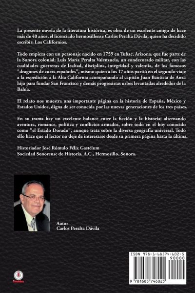 La presente novela de la literatura histórica, es obra de un excelente amigo de hace más de 40 años, el licenciado hermosillense Carlos Peralta Dávila, quien ha decidido escribir: Los Californios. Todo empieza con un personaje nacido en 1759 en Tubac, Arizona, que fue parte de la Sonora colonial: Luis María Peralta Valenzuela, un condecorado militar, con las cualidades guerreras de lealtad, disciplina, integridad y valentía, de los famosos "dragones de cuera españoles", mismo quien a los 17 años partió en el segundo viaje a la expedición a la Alta California acompañando al capitán Juan Bautista de Anza hijo para fundar San Francisco y demás progresistas urbes levantadas alrededor de la Bahía. El relato nos muestra una importante página en la historia de España, México y Estados Unidos, digna de ser conocida por las nuevas generaciones de los tres países. En su trama hay un excelente balance entre la cción y la historia; alternando aventura, romance, política y con ictos armados, sobre todo en el hoy conocido como "el Estado Dorado", aunque trata sobre la diversa geografía universal. Todo ello hace que el lector no deje de interesarse desde su primera página hasta la última. Historiador José Rómulo Félix Gastélum Sociedad Sonorense de Historia, A.C., Hermosillo, Sonora.