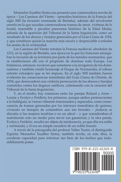 Monseñor Eusébio Sintra nos presenta una conmovedora novela de época - Los Caminos del Viento - episodios históricos de la Francia del siglo XIII (la invasión normanda de Bretaña), además del envolvente enredo en la que suceden conmovedoras tramas de amor, víctimas de lo brutal, insensible y peculiar panorama histórico de la Edad Media, además de la aparición del Tribunal de la Santa Inquisición, como un resultado de los abusos y herejías generados por el Gran Cisma de 1054, y que constituye quizás la mancha más oscura y despreciable a enlodar los anales de la cristiandad. Los Caminos del Viento retratan la Francia medieval, alrededor de 1212, en la región de Bretaña, una época en la que los franceses amargaban la invasión de su territorio por parte de los temidos normandos, que se establecieron allí con el propósito de dominar toda Europa. Los británicos, entonces, tuvieron que someterse a la arrogancia de los dominadores y también rendir homenaje al Duque de Normandía, el odioso señorío extranjero que se les impuso. En el siglo XIII también fueron evidentes las consecuencias inmediatas del Gran Cisma de Oriente, de 1054, que desencadenó una violenta persecución de los abusos y herejías cometidos contra los dogmas católicos, culminando con la creación del Tribunal de la Santa Inquisición. Y, en el medio, hay romances entre las parejas Roland y Anne - Louise y Evelyn y Frédéric; los primeros, aunque ambos pertenecientes a la hidalguía, se vieron vilmente traicionados y separados, como consecuencia de tramas generadas por los intereses inmediatos de quienes, viviendo en tiempos de costumbres aun tan brutales - ¡todavía se discutía si las mujeres tendrían o no un alma! - y que consideraban el matrimonio solo un medio para servir sus ganancias; y la otra pareja, Evelyn y Frédéric, resultó ser objeto de intolerancia, ya que ella era noble y normanda, y él era un simple escudero de un noble francés. A través de la psicografía del profesor Valter Turini, el distinguido Espíritu Monseñor Eusébio Sintra, también revela, en esta obra, la excelente capacidad para informar tan bien de los hechos que indudablemente posee.