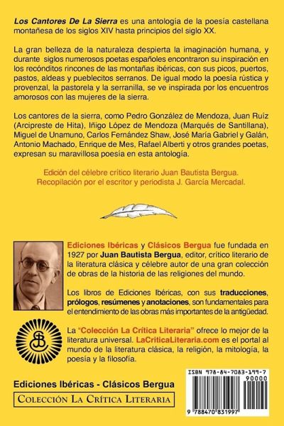 Antología de la poesía castellana de las montañas ibéricas desde el Siglo XIV. Edición del célebre crítico literario Juan Bautista Bergua de Ediciones Ibéricas. Recopilación por el escritor y periodista J. García Mercadal. Los Cantores De La Sierra es una antología de la poesía castellana de las montañas ibéricas desde el Siglo XIV hasta principios del Siglo XX. La gran belleza de la montaña y la naturaleza abre la imaginación humana y durante los siglos numerosos poetas españoles encontraron su inspiración en los recónditos rincones de las montañas ibéricas, con sus picos, puertos, pastos, aldeas y pueblecitos serranos. La poesía rústica y provenzal, la pastorela y la serranilla, se inspira en los encuentros amorosos con las mujeres de la sierra. Los cantores de la sierra como Pedro González de Mendoza, Juan Ruíz (Arcipreste de Hita), Iñigo López de Mendoza (Marqués de Santillana), Miguel de Unamuno, Carlos Fernández Shaw, José María Gabriel y Galán, Antonio Machado, Enrique de Mes, Rafael Alberti y otros grandes poetas se expresan su maravillosa poesía en esta antología.