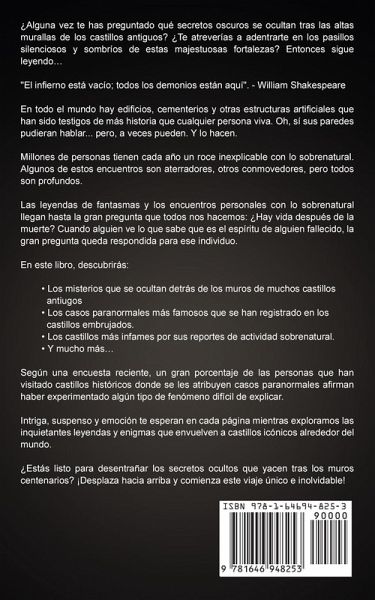 ¿Alguna vez te has preguntado qué secretos oscuros se ocultan tras las altas murallas de los castillos antiguos? ¿Te atreverías a adentrarte en los pasillos silenciosos y sombríos de estas majestuosas fortalezas? Entonces sigue leyendo... "El infierno está vacío; todos los demonios están aquí". - William Shakespeare En todo el mundo hay edificios, cementerios y otras estructuras artificiales que han sido testigos de más historia que cualquier persona viva. Oh, sí sus paredes pudieran hablar... pero, a veces pueden. Y lo hacen. Millones de personas tienen cada año un roce inexplicable con lo sobrenatural. Algunos de estos encuentros son aterradores, otros conmovedores, pero todos son profundos. Las leyendas de fantasmas y los encuentros personales con lo sobrenatural llegan hasta la gran pregunta que todos nos hacemos: ¿Hay vida después de la muerte? Cuando alguien ve lo que sabe que es el espíritu de alguien fallecido, la gran pregunta queda respondida para ese individuo. En este libro, descubrirás: Los misterios que se ocultan detrás de los muros de muchos castillos antiugos Los casos paranormales más famosos que se han registrado en los castillos embrujados. Los castillos más infames por sus reportes de actividad sobrenatural. Y mucho más... Según una encuesta reciente, un gran porcentaje de las personas que han visitado castillos históricos donde se les atribuyen casos paranormales afirman haber experimentado algún tipo de fenómeno difícil de explicar. Intriga, suspenso y emoción te esperan en cada página mientras exploramos las inquietantes leyendas y enigmas que envuelven a castillos icónicos alrededor del mundo. ¿Estás listo para desentrañar los secretos ocultos que yacen tras los muros centenarios? ¡Desplaza hacia arriba y comienza este viaje único e inolvidable!