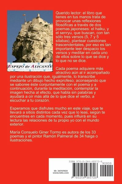 Querido lector: el libro que tienes en tus manos trata de provocar unas reflexiones filosóficas a través de dos poemas japoneses: el haiku, y el senryu, que buscan, con tan sólo tres versos (5, 7 y 5 sílabas), plantear cuestiones trascendentales, por eso es tan importante leer despacio los versos y meditar en cada uno de ellos sobre lo que se dice y lo que no se dice. Cada poema adquiere más atractivo aún al ir acompañado por una ilustración que, igualmente, lo transcribe mediante un dibujo hecho exprofeso; aconsejando que se saboree éste conjuntamente con el poema y a continuación, durante la meditación, contemplar la imagen hecha al efecto, que habla sin palabras y ayudará a oír más allá de lo que dice el verbo, a escuchar a tu corazón. Esperamos que disfrutes mucho en este viaje, que te llevará a sitios distintos cada vez que lo leas, según te encuentres en cada momento... María Consuelo Giner Tormo es autora de los 33 poemas y el pintor Ramón Palmeral de 34 haiga o ilustraciones.