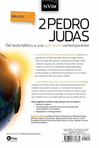 Aprende la retadora pero importante tarea de transportar el mensaje antiguo de la Palabra de Dios a un contexto moderno y claro, utilizando Los Comentarios B¿¿blicos con aplicaci¿¿n NVI. Estos comentarios adem¿¿s de enfocarse en la aplicaci¿¿n de un pasaje, tambi¿¿n nos permite pensar en el proceso por el cual se desarrolla un texto en su sentido original hasta llegar a su significado contempor¿¿neo. Son verdaderos comentarios, no exposiciones populares. Siendo obras de referencia y no de literatura devocional. En cada comentario encontrar¿¿s: El significado del texto b¿¿blico en su contexto del primer siglo (Sentido Original) La conexi¿¿n entre el contexto original de la Biblia y su aplicaci¿¿n contempor¿¿neo (Construyendo Puentes) La aplicaci¿¿n de un mensaje b¿¿blico contempor¿¿neo con el mismo poder que fue escrito en el pasado. NVI Application Commentary: 2 Peter and Jude Learn the exciting but important task of translating the ancient message of God's Word into a clear modern context using the NIV Bible Commentaries with application. These commentaries not only focus on the application of a passage, but also allow us to think about the process by which a text develops from its original meaning to its contemporary sense. These are true commentaries, not popular expositions. Being works of reference and not devotional literature. In each commentary you will find: The meaning of the biblical text in its first century context (Original Meaning). The connection between the original context of the Bible and its contemporary application (Building Bridges). The application of a contemporary biblical message with the same power as it was written in the past.