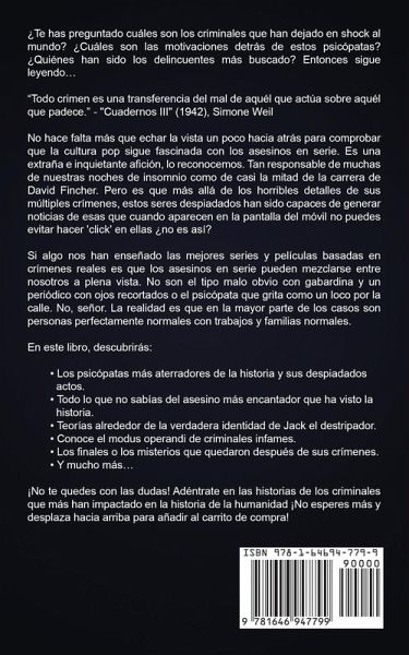 ¿Te has preguntado cuáles son los criminales que han dejado en shock al mundo? ¿Cuáles son las motivaciones detrás de estos psicópatas? ¿Quiénes han sido los delincuentes más buscados? Entonces sigue leyendo... "Todo crimen es una transferencia del mal de aquél que actúa sobre aquél que padece." - "Cuadernos III" (1942), Simone Weil No hace falta más que echar la vista un poco hacia atrás para comprobar que la cultura pop sigue fascinada con los asesinos en serie. Es una extraña e inquietante afición, lo reconocemos. Tan responsable de muchas de nuestras noches de insomnio como de casi la mitad de la carrera de David Fincher. Pero es que más allá de los horribles detalles de sus múltiples crímenes, estos seres despiadados han sido capaces de generar noticias de esas que cuando aparecen en la pantalla del móvil no puedes evitar hacer 'click' en ellas ¿no es así? Si algo nos han enseñado las mejores series y películas basadas en crímenes reales es que los asesinos en serie pueden mezclarse entre nosotros a plena vista. No son el tipo malo obvio con gabardina y un periódico con ojos recortados o el psicópata que grita como un loco por la calle. No, señor. La realidad es que en la mayor parte de los casos son personas perfectamente normales con trabajos y familias normales. En este libro, descubrirás: Los psicópatas más aterradores de la historia y sus despiadados actos. Todo lo que no sabías del asesino más encantador que ha visto la historia. Teorías alrededor de la verdadera identidad de Jack el destripador. Conoce el modus operandi de criminales infames. Los finales o los misterios que quedaron después de sus crímenes. Y mucho más... ¡No te quedes con las dudas! Adéntrate en las historias de los criminales que más han impactado en la historia de la humanidad ¡No esperes más y desplaza hacia arriba para añadir al carrito de compra!