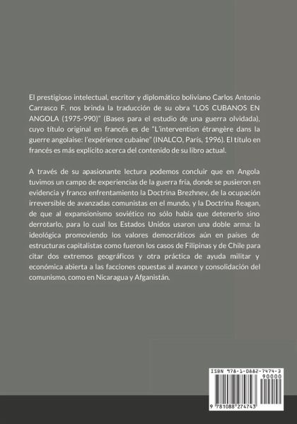 El prestigioso intelectual, escritor y diplomático boliviano Carlos Antonio Carrasco F. nos brinda la traducción de su obra "LOS CUBANOS EN ANGOLA (1975-990)" (Bases para el estudio de una guerra olvidada), cuyo título original en francés es de "L'intervention étrangère dans la guerre angolaise: l'expérience cubaine" (INALCO, París, 1996). El título en francés es más explícito acerca del contenido de su libro actual. A través de su apasionante lectura podemos concluir que en Angola tuvimos un campo de experiencias de la guerra fría, donde se pusieron en evidencia y franco enfrentamiento la Doctrina Brezhnev, de la ocupación irreversible de avanzadas comunistas en el mundo, y la Doctrina Reagan, de que al expansionismo soviético no sólo había que detenerlo sino derrotarlo, para lo cual los Estados Unidos usaron una doble arma: la ideológica promoviendo los valores democráticos aún en países de estructuras capitalistas como fueron los casos de Filipinas y de Chile para citar dos extremos geográficos y otra práctica de ayuda militar y económica abierta a las facciones opuestas al avance y consolidación del comunismo, como en Nicaragua y Afganistán.