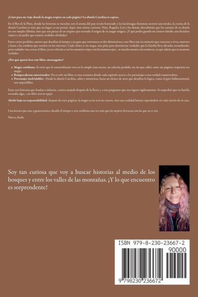 ¿Listo para un viaje donde la magia respira en cada página? La abuela Carolina te espera. En el Río de la Plata, donde las historias se mezclan con el aroma del pan recién horneado y las luciérnagas iluminan secretos ancestrales, la cocina de la abuela Carolina es más que un lugar: es un portal. Aquí, siete nietos curiosos: Naty, Rogelio, Leti y los demás, descubrirán que los cuentos de su abuela no son simples fábulas, sino que son piezas de un enigma que esconde el origen de su sangre mágica. ¿Y qué poder guarda un cartero tímido, una bicicleta viajera y un jardín que susurra verdades olvidadas? Entre cartas perdidas, amores que desafían el tiempo y un gato que ronronrea en dos dimensiones, este libro teje un misterio que conectar a vivos, muertos y hasta a las sombras que sonríen en los rincones. Cada relato es un mapa, una pista para desenterrar verdades que la familia lleva décadas escondiendo, pero cuidado: tras cerrar el libro, ya no volverás a ver los armarios viejos con los mismos ojos... ni mucho menos a las muñecas, ya que sabrás que te susurran verdades. ¿Por qué querés leer este libro, moranguito?Magia cotidiana: Si creés que lo extraordinario vive en lo simple (una receta, un calcetín perdido, un río que calla), entre sus páginas respirarás esa magia. Rompecabezas emocionales: No es solo un libro, es una aventura donde cada capítulo acerca a los personajes a una verdad conmovedora. Personajes inolvidables : Desde la abuela Carolina, sabia y misteriosa, hasta un elenco de seres que desafían la lógica, como el gato bidimensional, son imperdibles. Estas son historias que huelen a infancia, a tierra mojada después de la lluvia y a esas preguntas que nos siguen sigilosamente. Si sospechás que tu familia escondía algo... este libro será tu espejo. Abrilo bajo tu responsabilidad: después de estas páginas, la magia ya no será un cuento, sino una realidad latente esperándote en cada rincón de tu casa. - Una lectura que une a generaciones, desafía el tiempo y nos confirma una vez más que las mejores herencias son las que no se ven. Nueva charla
