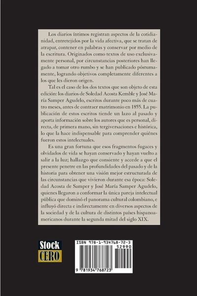 The private diaries record aspects of everyday life, woven together by the affective life, in an attempt to capture and contain them in words, and to retain them through writing. They originated as texts for exclusive personal use, but by subsequent developments, they have come to take another course and have been published posthumously, achieving completely different goals from those that initiated them. Such is the case of the two texts that are the subject of this edition: the diaries of Soledad Acosta Kemble and José Maria Samper Agudelo, written during four months and four days, before their authors got married in 1855. The publication of these writings creates a bridge to the past and provides information about the writers that is personal, direct, first-hand, without distortions and historical, which makes it essential to understand who these intellectuals were. It is a great fortune that those fleeting and forgotten fragments of life have been preserved and have come to light again; a finding that allows the present to penetrate into the depths of the past and history, in order to obtain a better structured view of the circumstances in which they lived during that era. Soledad Acosta de Samper and José María Samper Agudelo became the only intellectual and public couple that dominated the Colombian cultural landscape and influenced directly and indirectly various aspects of society and culture of several Latin American countries during the second half of the nineteenth century. This is a great text for courses on Women's Studies, Cultural Studies, Gender Studies, Gender Research, Critical Culture, Sexuality Studies, Cultural Analysis, Latin American Literature, Latin American Studies, Hispanic Literatures, Hispanic Studies.
