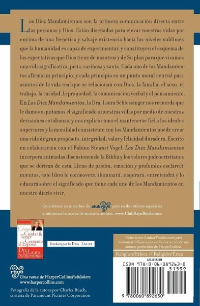 Los Diez Mandamientos son la primera comunicación directa entre las personas y Dios. Están diseñados para elevar nuestras vidas por encima de una frenética y salvaje existencia hacia los niveles sublimes que la humanidad es capaz de experimentar, y constituyen el esquema de las expectativas que Dios tiene de nosotros y de Su plan para que vivamos una vida significativa, justa, cariñosa y santa. Cada uno de los Mandamientos afirma un principio, y cada principio es un punto moral central para asuntos de la vida real que se relacionan con Dios, la familia, el sexo, el trabajo, la caridad, la propiedad, la comunicación verbal y el pensamiento. En Los Diez Mandamientos, la Dra. Laura Schlessinger nos recuerda que le damos o quitamos el significado a nuestras vidas por medio de nuestras decisiones cotidianas, y nos explica cómo el mantenerse fiel a los ideales superiores y la moralidad consistente con los Mandamientos puede crear una vida de gran propósito, integridad, valor y felicidad duradera. Escrito en colaboración con el Rabino Stewart Vogel, Los Diez Mandamientos incorpora animadas discusiones de la Biblia y los valores judeocristianos que se derivan de esta. Lleno de pasión, emoción y profundos esclarecimientos, este libro lo conmoverá, iluminará, inspirará, entretendrá y lo educará sobre el significado que tiene cada uno de los Mandamientos en nuestro diario vivir.