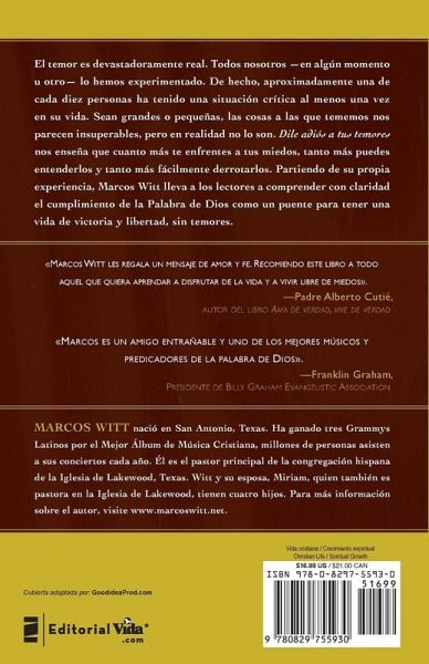 El temor es devastadoramente real. Todos nosotros -- en algun momento u otro -- lo hemos experimentado. De hecho, aproximadamente una de cada diez personas ha tenido una situacion critica al menos una vez en su vida. Sean grandes o pequenas, las cosas a las que tememos nos parecen insuperables, pero en realidad no lo son. Dile adios a tus temores nos ensena que cuanto mas te enfrentes a tus miedos, tanto mas puedes entenderlos y tanto mas facilmente derrotarlos. Partiendo de su propia experiencia, Marcos Witt lleva a los lectores a comprender con claridad el cumplimiento de la Palabra de Dios como un puente para tener una vida de victoria y libertad, sin temores.