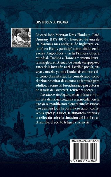 Edward John Moreton Drax Plunkett –Lord Dunsany (1878-1957)–, heredero de una de las baronías más antiguas de Inglaterra, estudió en Eton y participó como oficial en la guerra Anglo-Boer y en la Primera Guerra Mundial. Tradujo a Horacio y enseñó literatura inglesa en Atenas, de donde escapó poco antes de la invasión nazi. Escribió poesía, ensayo y novela, y conoció además enorme éxito como dramaturgo. Es considerado como el primer escritor de cuentos de fantasía para adultos, y como tal fue admirado por autores de la talla de Lovecraft, Tolkien y Borges. Sobre su labor como narrador Lovecraft escribió: «dibuja con formidable eficacia un cuerpo de mitos y leyendas dentro del círculo de la cultura europea, produciendo un ciclo compuesto por fantasías en las que cada sustancia (el colorido oriental, la forma helénica, la penumbra teutónica y el anhelo céltico) está soberbiamente mezclada y complementa al resto sin sacrificio de la congruencia y la homogeneidad». Los dioses de Pegana es su primera obra. En esta deliciosa teogonía crepuscular, en la que ya se manifiestan plenamente los rasgos que definen toda la obra de su autor, conviven la épica y la lírica, la atmósfera onírica y la reflexión sobre la situación del hombre en el mundo, el acento trágico y la ironía.