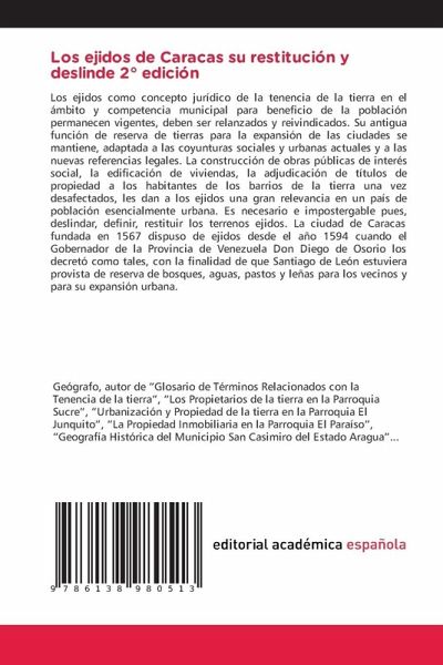 Los ejidos como concepto jurídico de la tenencia de la tierra en el ámbito y competencia municipal para beneficio de la población permanecen vigentes, deben ser relanzados y reivindicados. Su antigua función de reserva de tierras para la expansión de las ciudades se mantiene, adaptada a las coyunturas sociales y urbanas actuales y a las nuevas referencias legales. La construcción de obras públicas de interés social, la edificación de viviendas, la adjudicación de títulos de propiedad a los habitantes de los barrios de la tierra una vez desafectados, les dan a los ejidos una gran relevancia en un país de población esencialmente urbana. Es necesario e impostergable pues, deslindar, definir, restituir los terrenos ejidos. La ciudad de Caracas fundada en 1567 dispuso de ejidos desde el año 1594 cuando el Gobernador de la Provincia de Venezuela Don Diego de Osorio los decretó como tales, con la finalidad de que Santiago de León estuviera provista de reserva de bosques, aguas, pastos y leñas para los vecinos y para su expansión urbana.