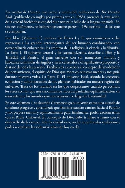 Los escritos de Urantia, una nueva y admirable traducción de The Urantia Book (publicado en inglés por primera vez en 1955), presenta la revelación de la verdad haciéndose eco del fluir natural y bello de la lengua española. En sus tres volúmenes, se incluyen las cuatro partes -196 escritos- de las que se componen. Este libro (Volumen 1) contiene las Partes I y II, que comienzan a dar respuestas a las grandes interrogantes del ser humano combinando, con extraordinaria coherencia, los ámbitos de la religión, la ciencia y la filosofía. La Parte I, El universo central y los suprauniversos, describe a Dios y la Trinidad del Paraíso, el gran universo con sus numerosos mundos y habitantes, miríadas de ángeles y seres celestiales y el significativo propósito y destino de toda la creación. También da a conocer el concepto del modelador del pensamiento, el espíritu de Dios que mora en nuestras mentes y nos guía durante nuestras vidas. La Parte II, El universo local, aborda la creación, evolución y administración de los planetas habitados en nuestra región del universo. Trata de los mundos en los que despertamos cuando perecemos, los seres con los que nos encontramos, nuestra paulatina espiritualización en estas esferas y los mundos que nos esperan a lo largo de la eternidad. En este volumen 1, se describe el inmenso gran universo como una escuela de continuo progreso y aprendizaje que ilumina nuestro camino hacia el Paraíso y nos prepara mental y espiritualmente para, finalmente, poder encontrarnos con el Padre Universal. El concepto de Dios debe ir mano a mano con el desarrollo de la ciencia. Solo la verdad viva, no las anquilosadas tradiciones, podrá revitalizar las sedientas almas de hoy en día.