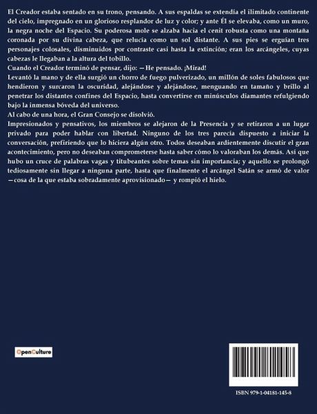 El Creador estaba sentado en su trono, pensando. A sus espaldas se extendía el ilimitado continente del cielo, impregnado en un glorioso resplandor de luz y color; y ante Él se elevaba, como un muro, la negra noche del Espacio. Su poderosa mole se alzaba hacia el cenit robusta como una montaña coronada por su divina cabeza, que relucía como un sol distante. A sus pies se erguían tres personajes colosales, disminuidos por contraste casi hasta la extinción; eran los arcángeles, cuyas cabezas le llegaban a la altura del tobillo. Cuando el Creador terminó de pensar, dijo: ¿He pensado. ¡Mirad! Levantó la mano y de ella surgió un chorro de fuego pulverizado, un millón de soles fabulosos que hendieron y surcaron la oscuridad, alejándose y alejándose, menguando en tamaño y brillo al penetrar los distantes confines del Espacio, hasta convertirse en minúsculos diamantes refulgiendo bajo la inmensa bóveda del universo. Al cabo de una hora, el Gran Consejo se disolvió. Impresionados y pensativos, los miembros se alejaron de la Presencia y se retiraron a un lugar privado para poder hablar con libertad. Ninguno de los tres parecía dispuesto a iniciar la conversación, prefiriendo que lo hiciera algún otro. Todos deseaban ardientemente discutir el gran acontecimiento, pero no deseaban comprometerse hasta saber cómo lo valoraban los demás. Así que hubo un cruce de palabras vagas y titubeantes sobre temas sin importancia; y aquello se prolongó tediosamente sin llegar a ninguna parte, hasta que finalmente el arcángel Satán se armó de valor ¿cosa de la que estaba sobradamente aprovisionadö y rompió el hielo.