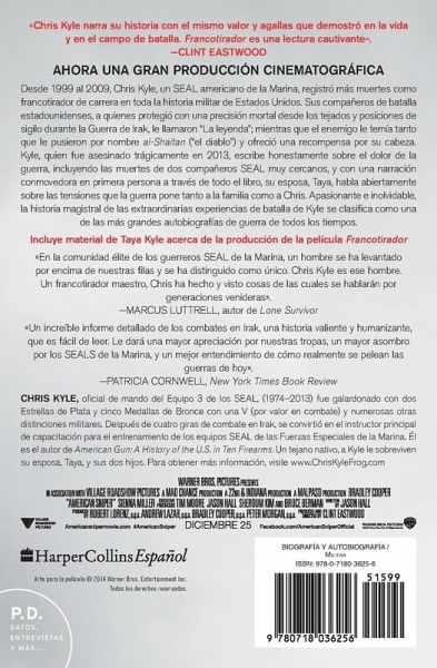 Fascinante, reveladora y poderosa, Francotirador la asombrosa autobiograf¿¿a del Capit¿¿n SEAL Chris Kyle, el francotirador que tuvo el r¿¿cord m¿¿s alto en la historia militar estadounidense. En Francotirador, Kyle relata la extraordinaria historia de su carrera que dur¿¿ una d¿¿cada. El fascinante relato de c¿¿mo pas¿¿ de ser un cowboy de rodeos de Texas a ser un experto franco tirador y temido asesino, ofrece una perspectiva ¿¿nica de la guerra actual y una de las descripciones m¿¿s profundas, reveladoras y jam¿¿s escritas del mundo secreto de Special Ops (Operaciones Especiales) de Estados Unidos. Esta obra, tambi¿¿n honra a los compä¿eros de guerra de Kyle, que lucharon dentro y fuera del campo de batalla, as¿¿ como con conmovedores relatos de su esposa Taya, quien habla abiertamente de las presiones de la guerra en su matrimonio, sus hijos, y en Chris. Extraordinario, inolvidable y cargado de adrenalina, el relato de Kyle se sit¿¿a como una de las mejores autobiograf¿¿as de guerra de todos los tiempos.