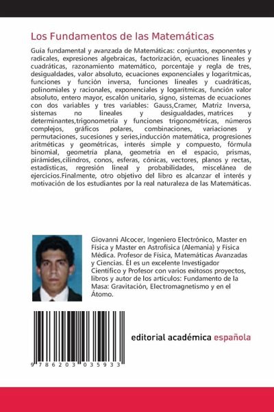 Guía fundamental y avanzada de Matemáticas: conjuntos, exponentes y radicales, expresiones algebraicas, factorización, ecuaciones lineales y cuadráticas, razonamiento matemático, porcentaje y regla de tres, desigualdades, valor absoluto, ecuaciones exponenciales y logarítmicas, funciones y función inversa, funciones lineales y cuadráticas, polinomiales y racionales, exponenciales y logarítmicas, función valor absoluto, entero mayor, escalón unitario, signo, sistemas de ecuaciones con dos variables y tres variables: Gauss,Cramer, Matriz Inversa, sistemas no lineales y desigualdades, matrices y determinantes,trigonometría y funciones trigonométricas, números complejos, gráficos polares, combinaciones, variaciones y permutaciones, sucesiones y series,inducción matemática, progresiones aritméticas y geométricas, interés simple y compuesto, fórmula binomial, geometría plana, geometría en el espacio, prismas, pirámides,cilindros, conos, esferas, cónicas, vectores, planos y rectas, estadísticas, regresión lineal y probabilidades, miscelánea de ejercicios.Finalmente, otro objetivo del libro es alcanzar el interés y motivación de los estudiantes por la real naturaleza de las Matemáticas.