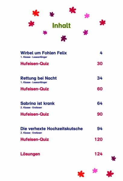 Großer Pferdespaß mit Bibi & Tina! Die Geschichten handeln von einem aufregenden Sommerfest auf dem Martinshof, einem verlorenen Bruder, um das kranke Pferd Sabrina und eine verhexte Hochzeitskutsche - Selbstverständlich mit jeder Menge Pferde. - Die vier Geschichten sind genau auf die Lesestufen 1 und 2 abgestimmt: Die Komplexität der Geschichten, das Verhältnis der Textmenge zu den Illustrationen, die Zeilenlänge und Schriftgröße. - Die optimale Kombination: Der Schulbuchprofi hilft beim Lesenlernen, Bibi & Tina motivieren zusätzlich. - Mit spannendem Hufeisen-Quiz und Lösungen. So werden Kinder begeisterte Leser!