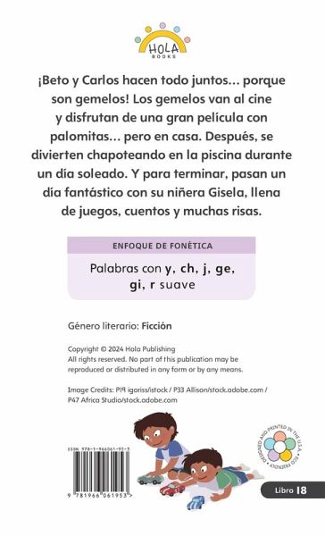 Los gemelos is a playful and engaging Spanish decodable reader for Grade 1 students, featuring three short stories centered on the lives of twin brothers, Beto and Carlos. With humor, heart, and plenty of realistic scenarios, this book invites early readers to build fluency and confidence while connecting with relatable characters and everyday experiences. Through these stories, children explore: The challenges of a big outing in Beto y Carlos van al cine A day of nonstop splashing fun in ¡Saltos en la piscina! Friendship, music, and bedtime routines in La niñera Each story is supported by: Pre-reading vocabulary breakdowns Decodable text aligned with phonics instruction Comprehension and language development questions Engaging "Did you know?" nonfiction features that extend learning This book helps students practice decoding longer words and common syllables while immersing them in stories that reflect the joy, energy, and unpredictability of early childhood. Perfect for small group instruction, independent reading, or take-home practice, Los gemelos blends foundational skill-building with culturally responsive storytelling that celebrates play, family, and everyday adventure.