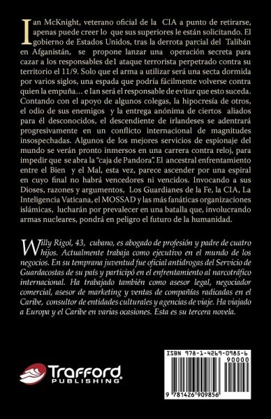Ian McKnight, veterano oficial de la CIA a punto de retirarse, apenas puede creer lo que sus superiores le están solicitando. El gobierno de Estados Unidos, tras la derrota parcial del Talibán en Afganistán, se propone lanzar una operación secreta para cazar a los responsables de1 ataque terrorista perpetrado contra su territorio el 11/9. Solo que el arma a utilizar será una secta dormida por varios siglos, una espada que podría fácilmente volverse contra quien la empuña... e Ian será el responsable de evitar que esto suceda. Contando con el apoyo de algunos colegas, la hipocresía de otros, el odio de sus enemigos y la entrega anónima de ciertos aliados para él desconocidos, el descendiente de irlandeses se adentrará progresivamente en un conflicto internacional de magnitudes insospechadas. Algunos de los mejores servicios de espionaje del mundo se verán pronto inmersos en una carrera contra reloj, para impedir que se abra la "caja de Pandora". El ancestral enfrentamiento entre el Bien y el Mal, esta vez, parece ascender por una espiral en cuyo final no habrá vencedores ni vencidos. Invocando a sus Dioses, razones y argumentos, Los Guardianes de la Fe, la CIA, La Inteligencia Vaticana, el MOSSAD y las más fanáticas organizaciones islámicas, lucharán por prevalecer en una batalla que, involucrando armas nucleares, pondrá en peligro el futuro de la humanidad.
