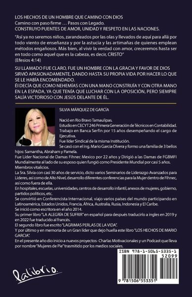 SILVIA MÁRQUEZ DE GARCÍA Nació en Rio Bravo Tamaulipas. Estudio en CECYT 246 Primera Generación de Técnicos en Contabilidad. Trabajo en Banca Serfin por 15 años desempeñando el cargo de Ejecutiva. Fue líder Sindical de la misma Institución. Se casó con el Ing. Mario García Olvera y formo una familia de 3 bellos hijos: Samantha, Abraham y Pamela. Fue Líder Nacional de Damas Fihnec Mexico por 22 años y Dirigió a las Damas de FGBMFI Mundialmente al lado de su esposo quien fungió como Presidente Mundial por casi 5 años. Miembros vitalicios. La Sra. Silvia con casi 30 años de servicio, dicto varios Seminarios de Liderazgo Avanzados para Lideres, así como de Alto Nivel, desarrollo diferentes conferencias para la Mujer dentro de Fihnec, así como fuera de ella. En hospitales, escuelas, universidades, centros de desarrollo infantil, anexos de mujeres, gobierno, partidos políticos, etc. Se convirtió en Conferencista Internacional, viajo varios países del mundo participando en Latinoamérica, Estados Unidos, Francia, África, Australia, Rusia, Indonesia y El Caribe. Se inició como escritora en el año 2014. Su primer libro "LA ALEGRÍA DE SUFRIR" en español para después traducirlo a ingles en 2019 y en 2022 fue traducido al francés. El segundo libro fue escrito "LAGRIMAS PERLAS DE LA VIDA". Y por último y en memoria de un Gran líder que dejo huella este libro "LOS HECHOS DE MARIO GARCIA". En el presente año dio inicio a nuevos proyectos- Charlas Motivacionales y un Podcast que lleva por nombre "Mujeres de Pie" trasmitido por los medios sociales.