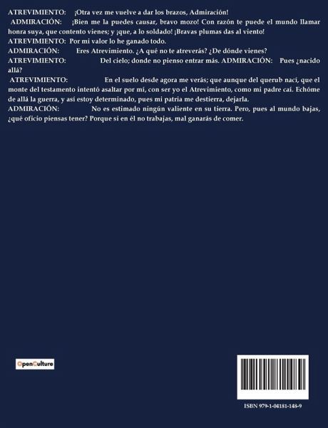 ATREVIMIENTO: ¡Otra vez me vuelve a dar los brazos, Admiración! ADMIRACIÓN: ¡Bien me la puedes causar, bravo mozo! Con razón te puede el mundo llamar honra suya, que contento vienes; y ¡que, a lo soldado! ¡Bravas plumas das al viento! ATREVIMIENTO: Por mi valor lo he ganado todo. ADMIRACIÓN: Eres Atrevimiento. ¿A qué no te atreverás? ¿De dónde vienes? ATREVIMIENTO: Del cielo; donde no pienso entrar más. ADMIRACIÓN: Pues ¿nacido allá? ATREVIMIENTO: En el suelo desde agora me verás; que aunque del querub nací, que el monte del testamento intentó asaltar por mí, con ser yo el Atrevimiento, como mi padre caí. Echóme de allá la guerra, y así estoy determinado, pues mi patria me destierra, dejarla. ADMIRACIÓN: No es estimado ningún valiente en su tierra. Pero, pues al mundo bajas, ¿qué oficio piensas tener? Porque si en él no trabajas, mal ganarás de comer.