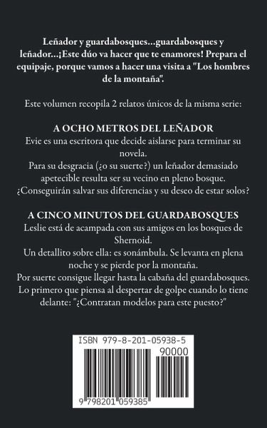Leñador y guardabosques...guardabosques y leñador...¡Este dúo va hacer que te enamores! Prepara el equipaje, porque vamos a hacer una visita a "Los hombres de la montaña". Este volumen recopila 2 relatos únicos de la misma serie: A OCHO METROS DEL LEÑADOR Evie es una escritora que decide aislarse para terminar su novela. Para su desgracia (¿o su suerte?) un leñador demasiado apetecible resulta ser su vecino en pleno bosque. ¿Conseguirán salvar sus diferencias y su deseo de estar solos? A CINCO MINUTOS DEL GUARDABOSQUES Leslie está de acampada con sus amigos en los bosques de Shernoid. Un detallito sobre ella: es sonámbula. Se levanta en plena noche y se pierde por la montaña. Por suerte consigue llegar hasta la cabaña del guardabosques. Lo primero que piensa al despertar de golpe cuando lo tiene delante: "¿Contratan modelos para este puesto?"